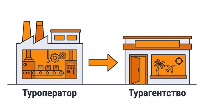 Туроператор — создатель турпродукта. У него прямые договоры с отелями, авиакомпаниями, принимающими компаниями. Он формирует пакетные туры, управляет ценами и каталогами, работает с гидами и зарубежными партнёрами, реализует туры как напрямую туристам, так и через агентскую сеть.