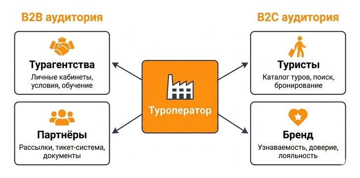 Целевая аудитория туроператора — двойная, и это принципиально важно для архитектуры сайта. Первая аудитория — турагентства: для них нужны отдельные разделы с условиями сотрудничества, рекламными турами, обучающими материалами, личными кабинетами. Информация здесь подаётся сжато и структурированно — агенты, как правило, уже знакомы с продуктом. Вторая аудитория — конечные туристы: все крупные операторы стремятся создать узнаваемый бренд, чтобы туристы сами запрашивали их продукт в агентствах.