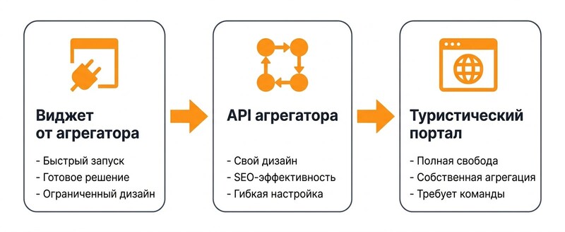 Агрегаторы предоставляют не только готовые виджеты, но и API — программный интерфейс, через который данные о турах можно получать напрямую и отображать в любом виде, в собственном дизайне, на собственных страницах.