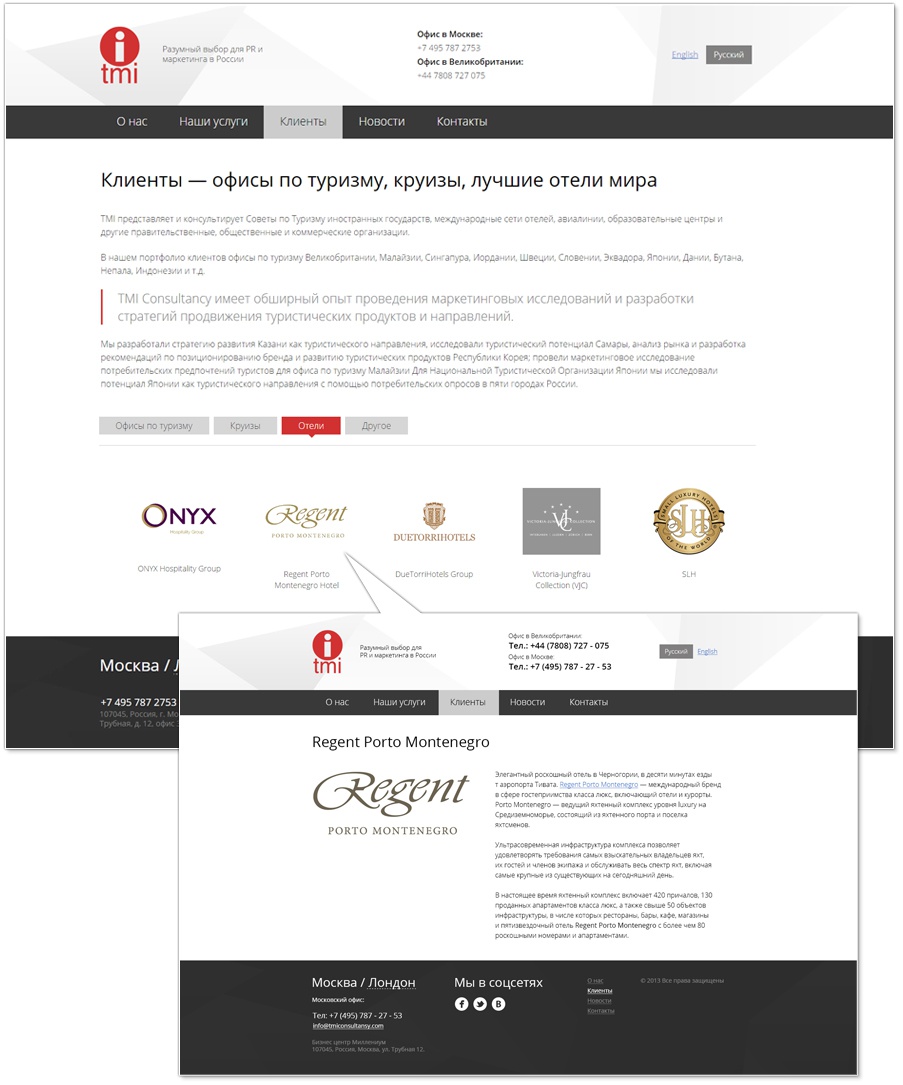Как и полагается, мы начали со сбора информации о компании, ее деятельности и потенциальных посетителях сайта. Итогом стали прототипы страниц для английской и русской частей сайта.